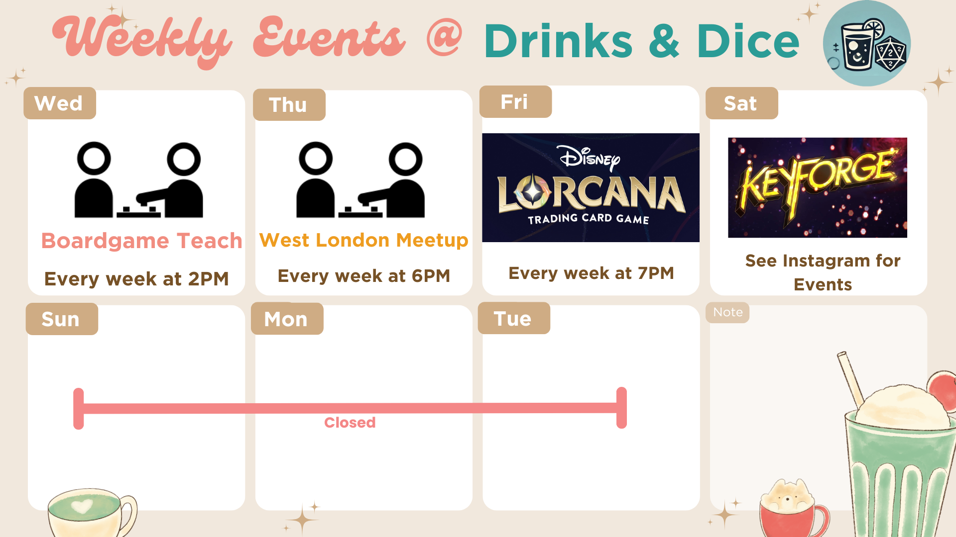 The West London Games club meets every Thursday at Drinks and Dice, starting at 6PM.